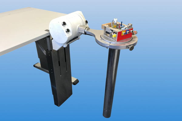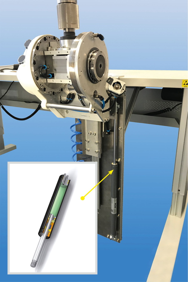 Die Montagehilfe ist an einem höhenverstellbaren Tisch befestigt, an dem sich eine senkrechte Linearführung aus Aluminium befindet. Diese ermöglicht es, den gesamten Gelenkkopf elektrisch angetrieben relativ zur Tischplatte nach oben und unten zu fahren. Um das Heben und Senken des Probenkopfhalters zu erleichtern, ist eine Gasdruckfeder des Typs GS-22-250 von ACE verbaut. Bei deren Auswahl wurde die gewünschte schnelle Umsetzung durch die Berechnungs- und Konfigurationstools auf der Homepage der ACE Stoßdämpfer unterstützt.