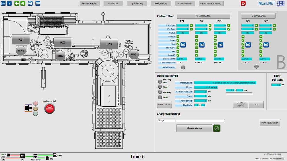 Erfassung und Anzeige von Messwerten und Betriebsmeldungen der Partikelzähler, Luftkeimsammler und Füllstandssonden der Filtrat-Sammelbehälter